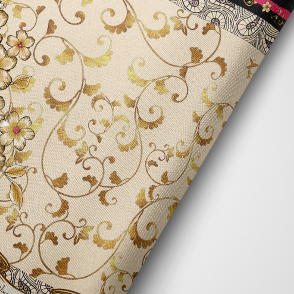 Χρυσές πινελιές προσδίδουν αρχοντικό χαρακτήρα, ενώ το μαύρο πλαίσιο και η φούξια ρίγα πλαισιώνουν ιδανικά το κεντρικό μοτίβο, αναδεικνύοντας την αισθητική του βάθους και της ισορροπίας.